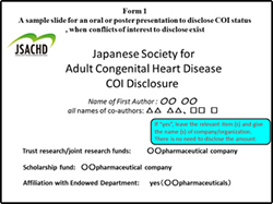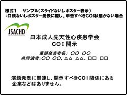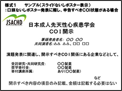 本会の学術集会で発表を行う筆頭演者は、発表時に開示をお願いします。すべての筆頭演者、共同演者の過去1年間におけるCOI状態の有無を、発表スライドの最初(または演題・発表者などを紹介するスライドの次)あるいはポスターの最後に下記に指定する様式により開示してください。