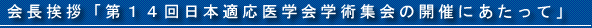 第14回日本適応医学会学術集会を平成22年7月2日(金)、3日(土)に東京都千代田区の日本学術総合センターで開催する運びとなりました。大変光栄に存じております。学会開催にあたり、会員の先生方並びに関係者の皆様からのご支援とご協力を心よりお願い申し上げる次第です。